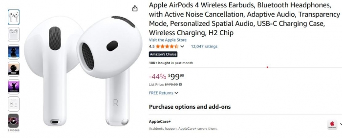 Trên Amazon, mẫu tai nghe True Wireless mới của Apple đang được bán với mức giá chỉ 79.99 USD cho AirPods 4 tiêu chuẩn và 99.99 USD cho AirPods 4 ANC – rẻ hơn khá nhiều so với giá niêm yết 129 USD và 179 USD của Apple.