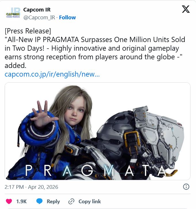 Trong thông cáo báo chí được đăng vừa qua, Capcom cho biết Pragmata – tựa game hành động góc nhìn thứ ba mới ra mắt của hãng – đã bán được hơn 1 triệu bản chỉ trong vòng 2 ngày.
