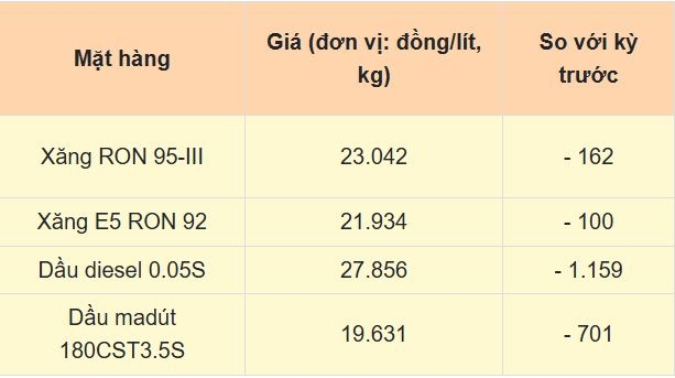 Các yếu tố nêu trên khiến giá thành phẩm xăng dầu thế giới xu hướng tăng, giảm tuỳ mặt hàng. Cụ thể, giá thành phẩm xăng RON 95 tăng 0,5%, dầu diesel giảm 3,8% và mazut 3,7%. Theo nhận định của nhiều chuyên gia, mặt bằng chung của giá xăng dầu trong nước hiện tại vẫn đang rẻ hơn rất nhiều so với các quốc gia khác trong khu vực Đông Nam Á.