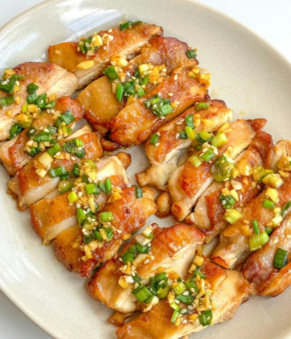 Bước 2: Làm nóng chảo rồi cho lượng dầu ăn vừa phải vào. Khi dầu nóng cho đùi gà vào chiên – mặt da chiên trước. Sau khi chiên chín vàng thì lật mặt còn lại và tiếp tục chiên cho đến khi cả 2 mặt thịt đùi gà có màu vàng kim. Sau đó bạn lấy ra, cắt thành các miếng vừa ăn rồi cho vào nồi. Rưới phần sốt muối dầu hành lên, đậy nắp và nấu trong khoảng 1 phút. Sau đó lấy ra đĩa là có thể thưởng thức.