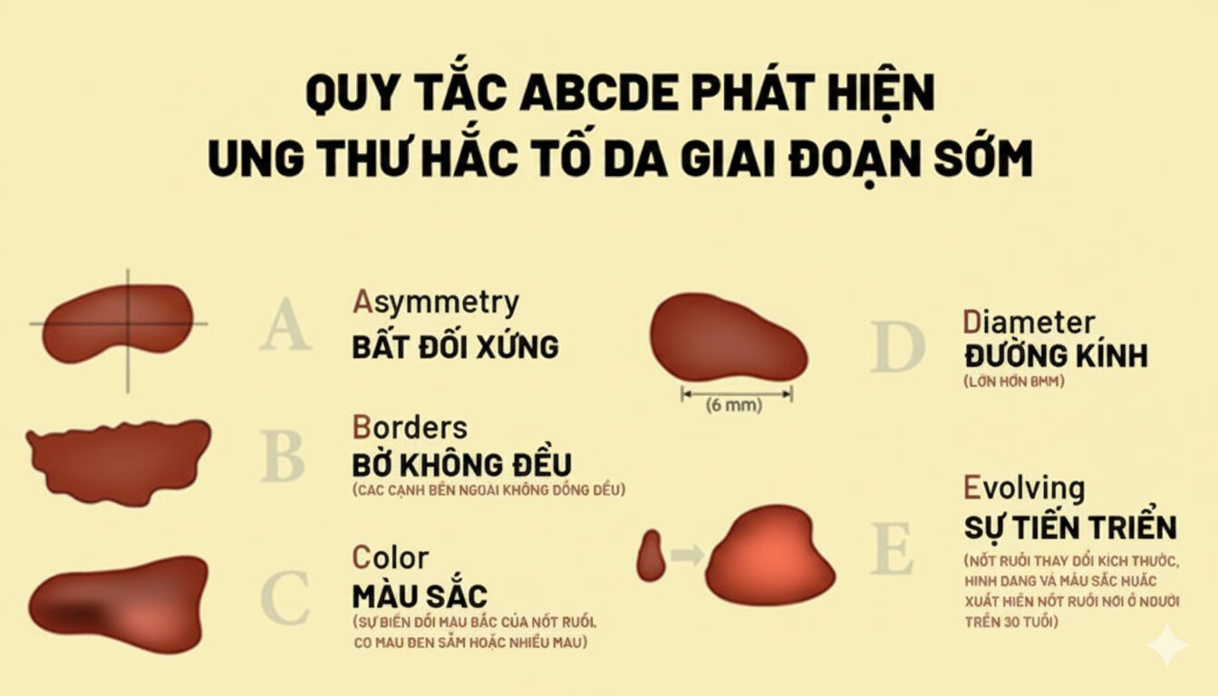 Việc phát hiện những thay đổi tinh vi trên da là trách nhiệm của mỗi người. Các chuyên gia y tế khuyến cáo, ai cũng cần áp dụng quy tắc ABCDE để tự kiểm tra các nốt ruồi hoặc đốm sẫm màu trên cơ thể