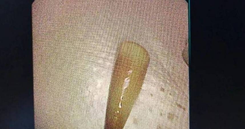 Nắp bút nhựa màu trắng bị mắc kẹt sâu trong phế quản, bao quanh là mô hạt. (Ảnh: Ningbo Evening News)